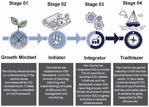 Untuk menerapkan ESG secara efektif, lembaga filantropi perlu terlebih dahulu menilai tingkat kematangan ESG mereka. Tidak semua organisasi berada di tahap yang sama. Beberapa baru mulai mengenal konsep ESG, sementara yang lain telah sepenuhnya mengintegrasikannya ke dalam proses pengambilan keputusan. Tingkat kematangan ESG sangat tergantung pada faktor-faktor seperti ukuran organisasi, ketersediaan sumber daya, dan komitmen kepemimpinan.